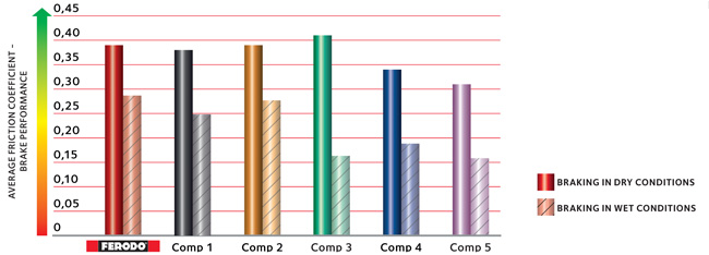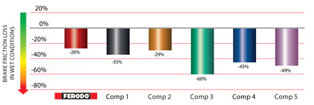 El gráfico anterior muestra el porcentaje de reducción del nivel de fricción, o el rendimiento de los frenos, entre el frenado en condiciones secas y húmedas, y Ferodo mostró la reducción más baja de seco a húmedo en comparación con algunos competidores.